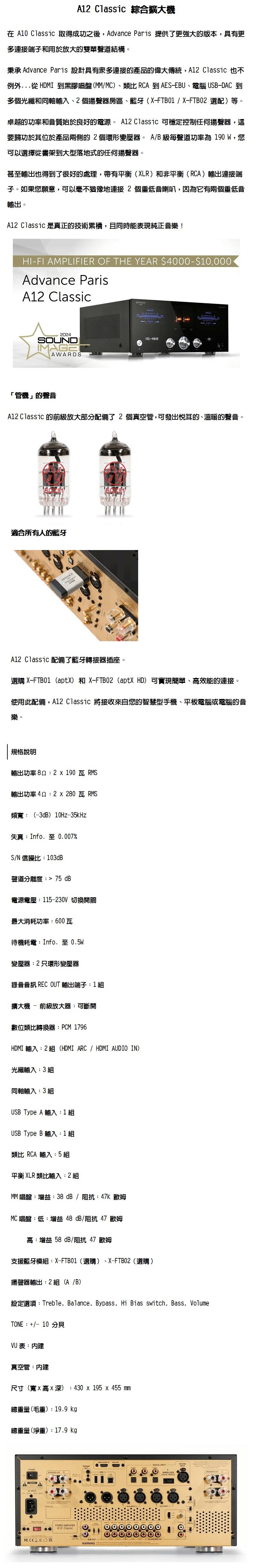 Advance Paris A12 Classic 綜合擴大機【韻城公司貨保固】