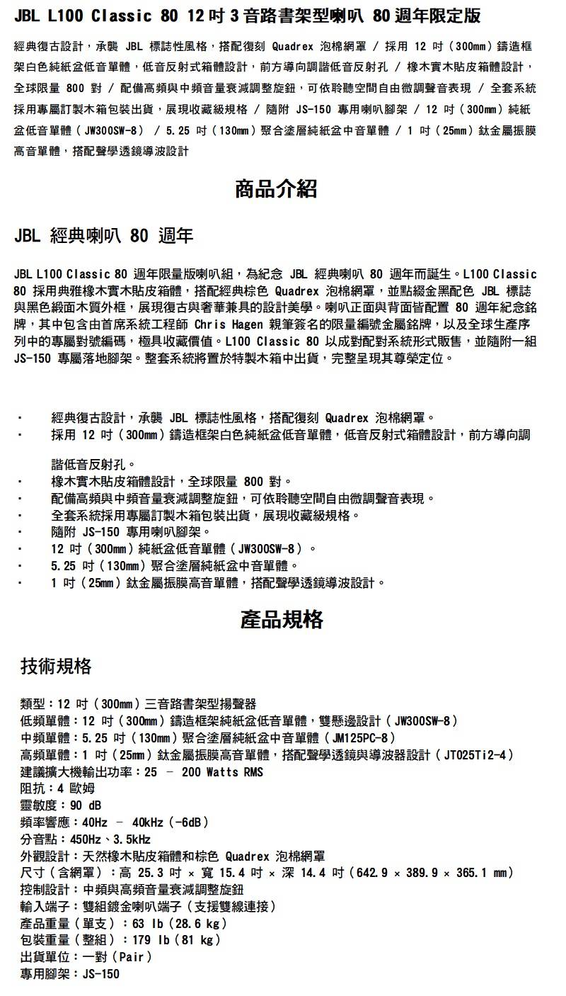 JBL L100 Classic 80 12吋3音路 80週年限定版喇叭 英大公司貨保固